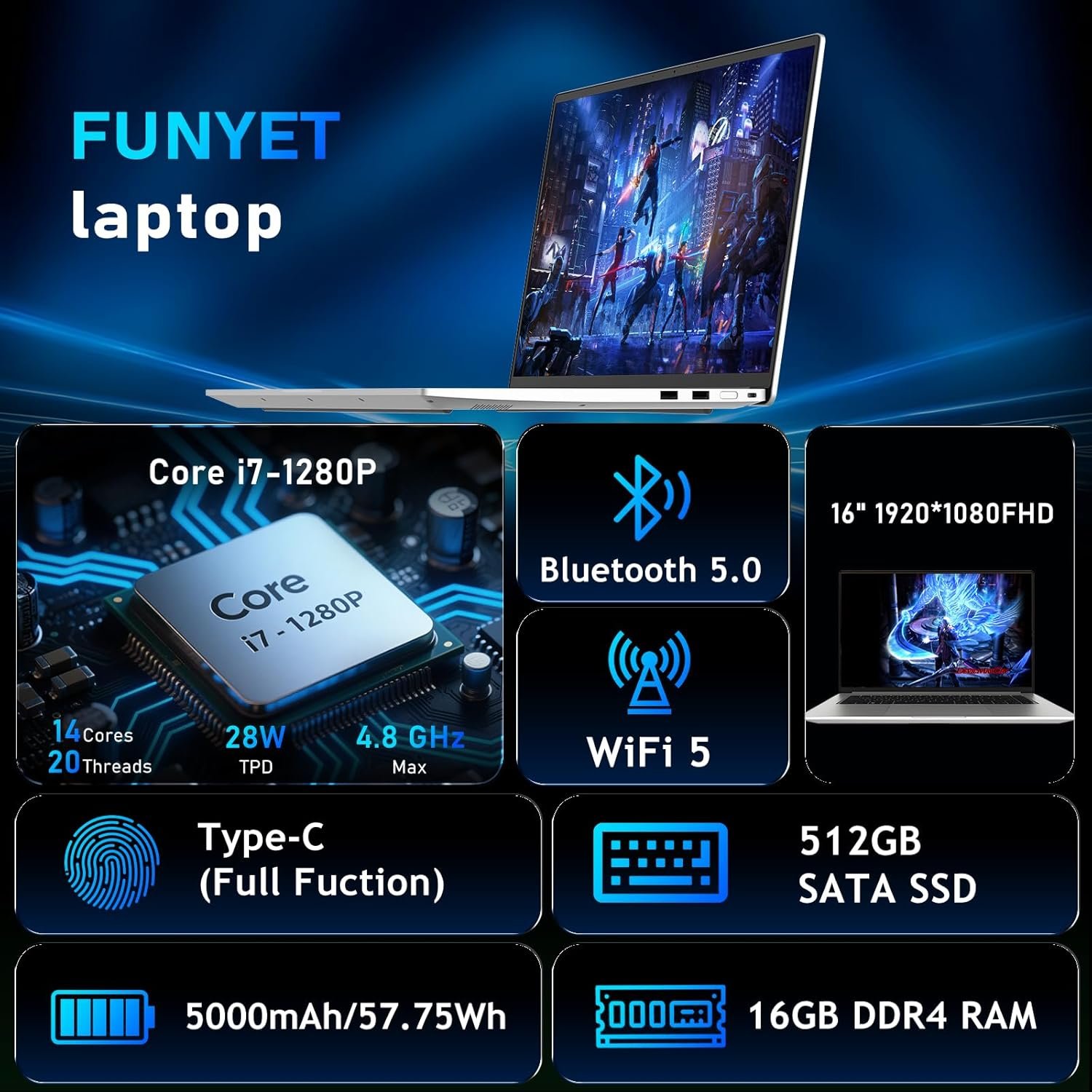 FUNYET Ordinateur portable 16 pouces, 16 Go de RAM, 512 Go SSD, Win 11 Pro, PC portable Processeur i7-1280P A6 (jusqu’à 4,8 GHz), FHD 1920 x 1080, clavier rétroéclairé