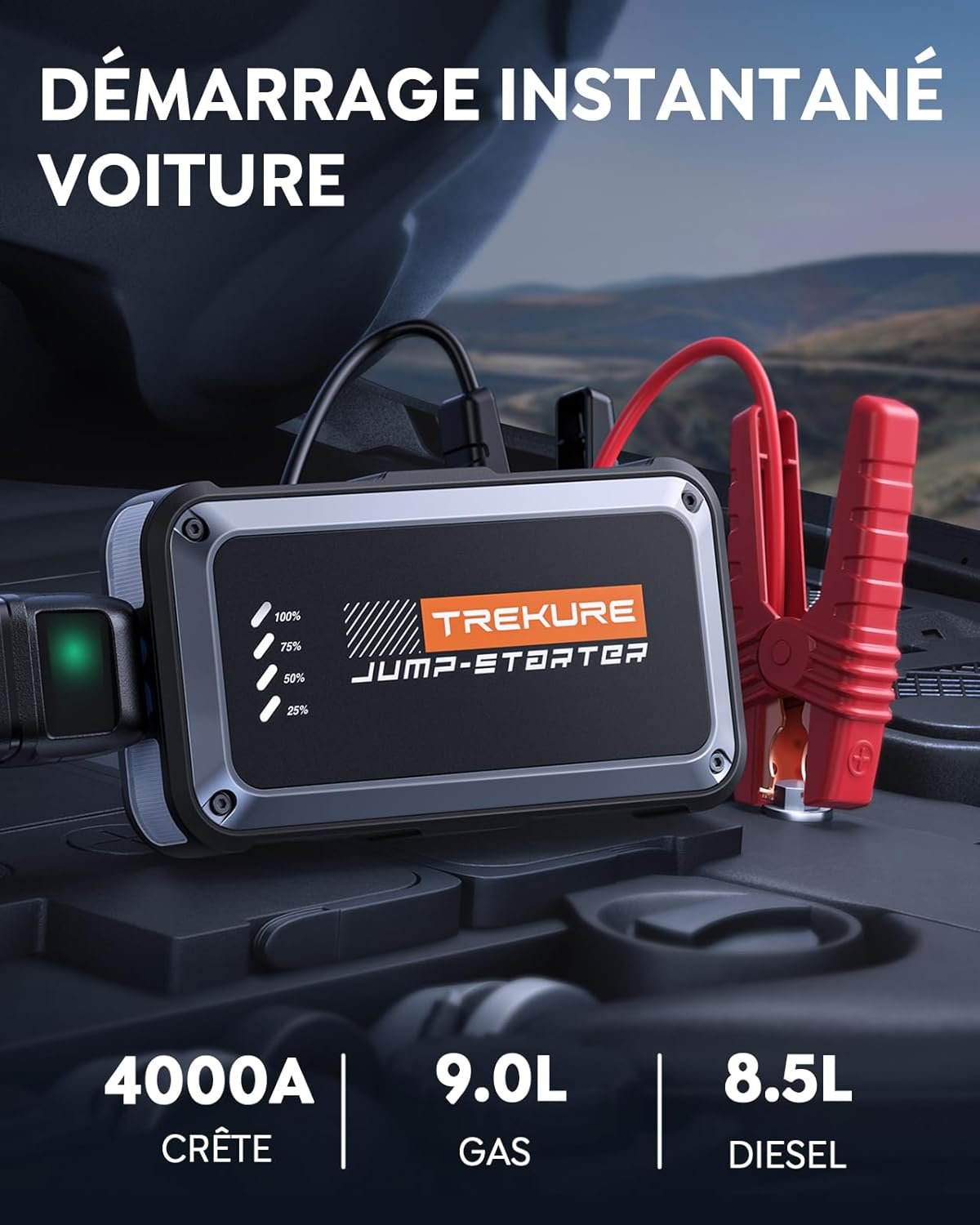 TREKURE Booster Batterie Voiture 4000A 16800mAh, 12V Démarreur Voiture (Jusqu’à 9.0L Essence & 8.5L Diesel), Booster Batterie Moto Portable, Pince Intelligente avec Affichage, Lumière LED à 4 Modes