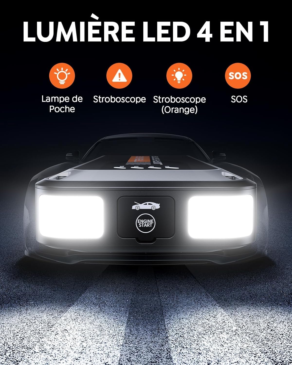 - 【300 Lumens Lampe LED Grand Angle 】Le booster batterie moto propose 4 modes d'éclairage : lampe torche, stroboscope, feu d'avertissement et mode SOS. La lampe de poche adopte une conception à double angle, la portée d'éclairage est plus large, et il peut également servir de triangle de signalisation. Idéal pour un usage quotidien, les voyages, les activités en plein air et les situations d'urgence.